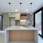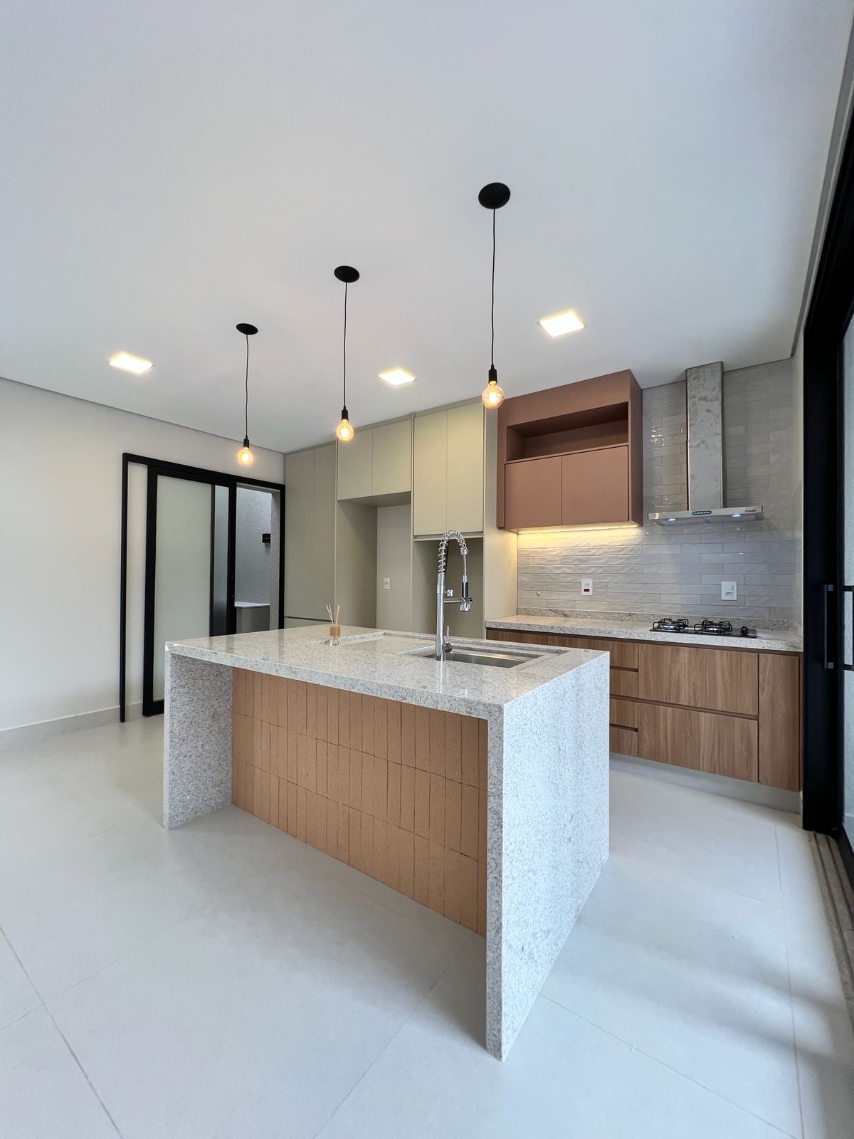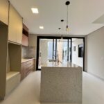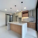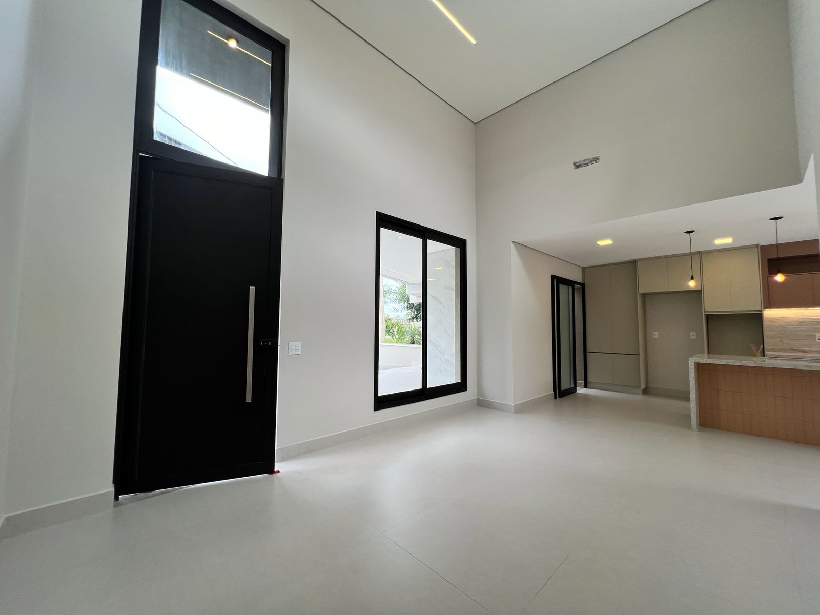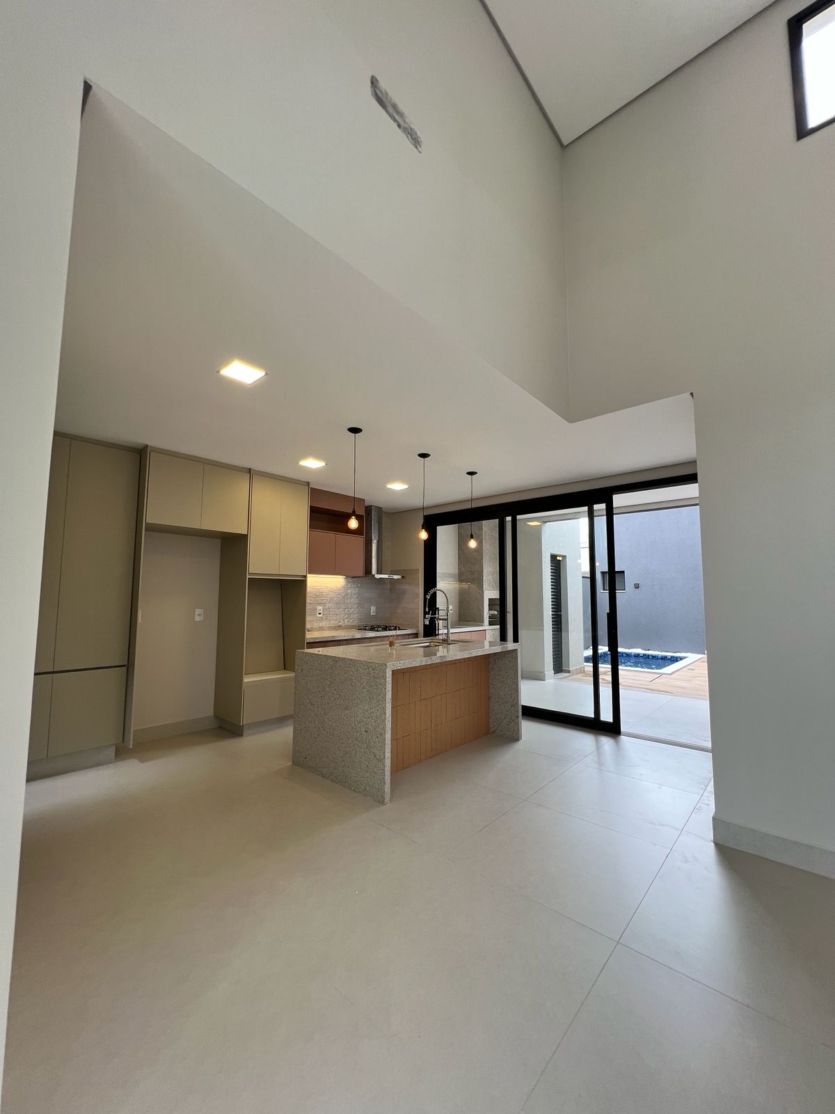 Logo na entrada, a porta imponente de 2,70m e a fechadura eletrônica reforçam a proposta contemporânea do projeto. A área social impressiona pelo pé-direito de aproximadamente 5 metros, proporcionando amplitude e excelente iluminação natural. A integração entre sala, cozinha e área gourmet cria um ambiente funcional e acolhedor. A cozinha conta com ilha central e mesa de jantar acoplada, além de armários de alto padrão. O espaço gourmet também é equipado, incluindo cooktop externo, ideal para momentos de convivência.
