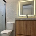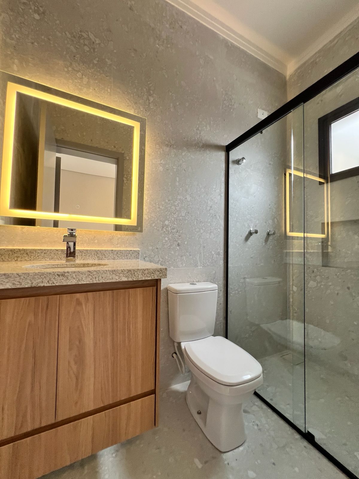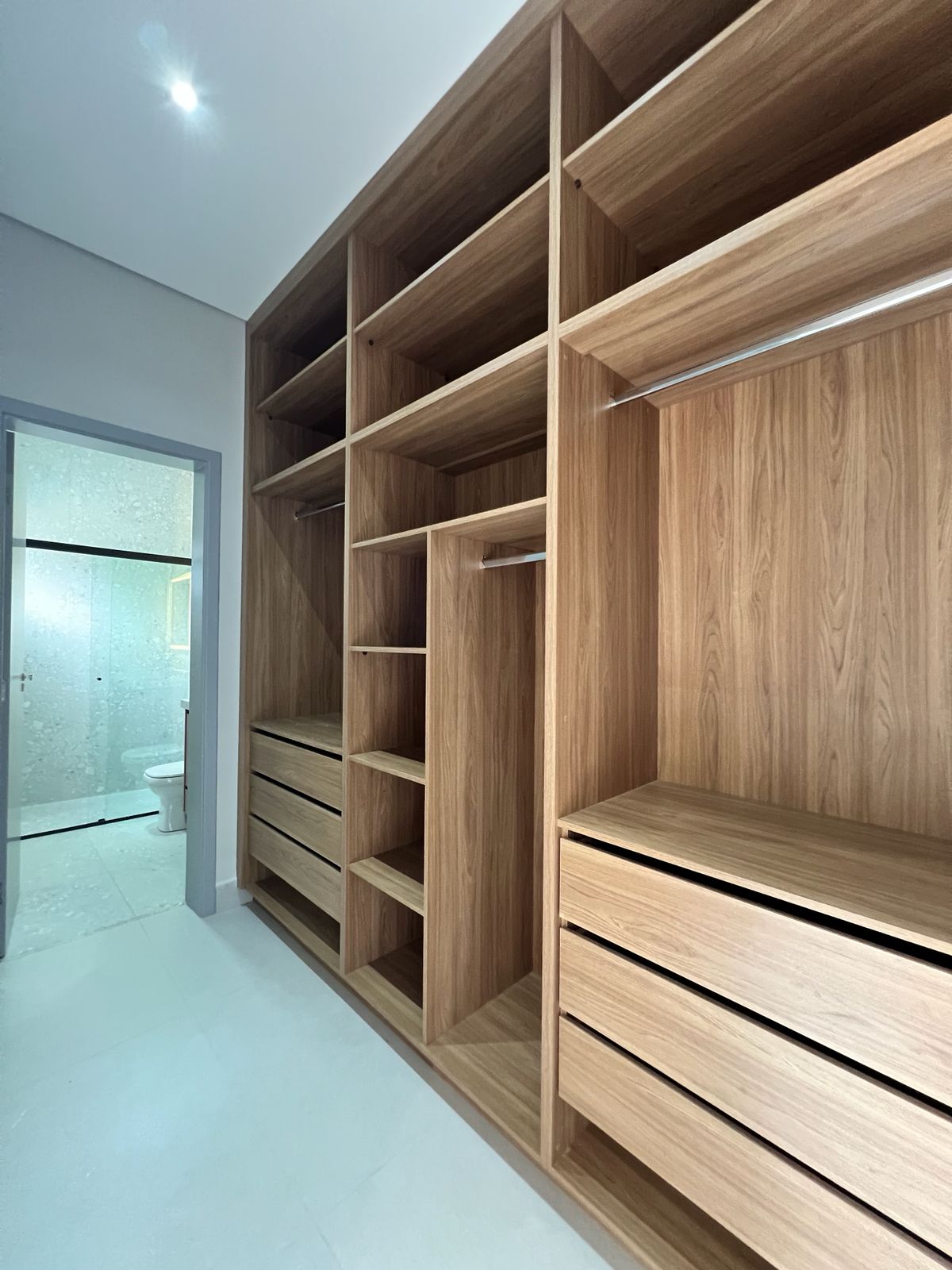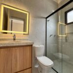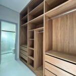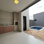 A casa dispõe de três suítes, sendo a principal com closet e marcenaria planejada. Os ambientes contam com persianas automatizadas, preparação para ar-condicionado e um projeto de iluminação em LED que valoriza cada espaço. Ao todo, são quatro banheiros, três deles com box já instalados.