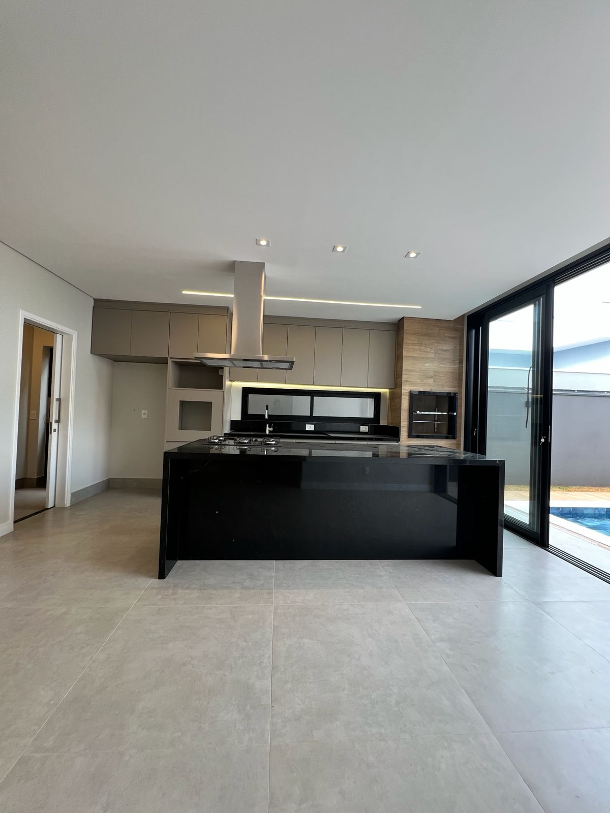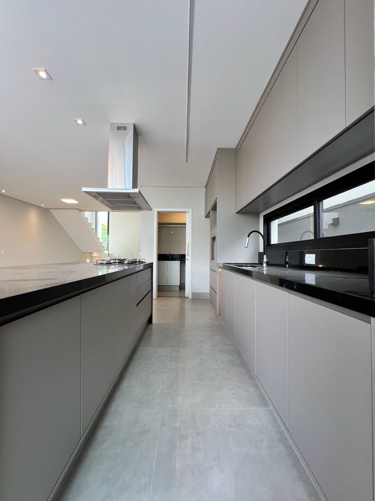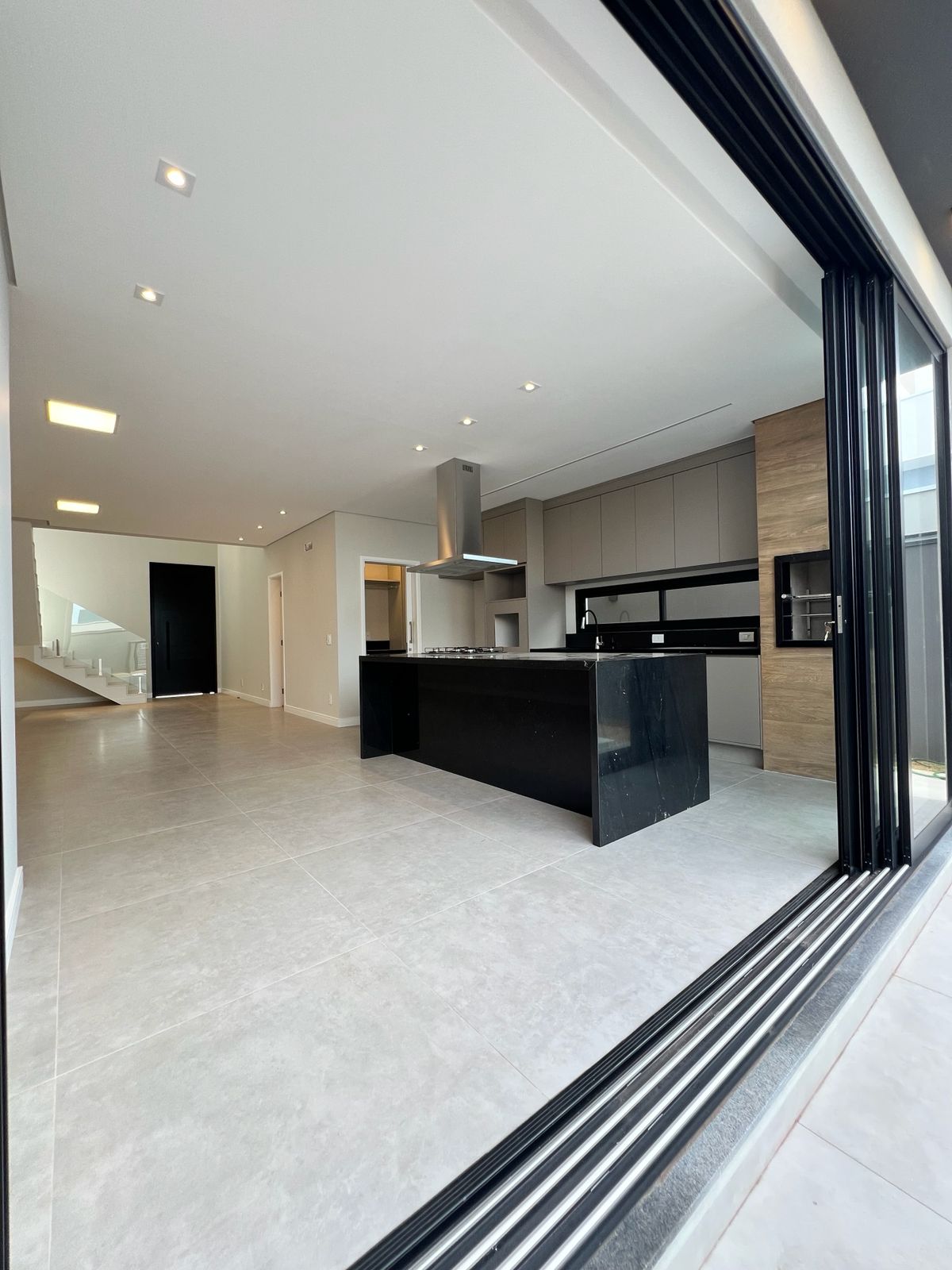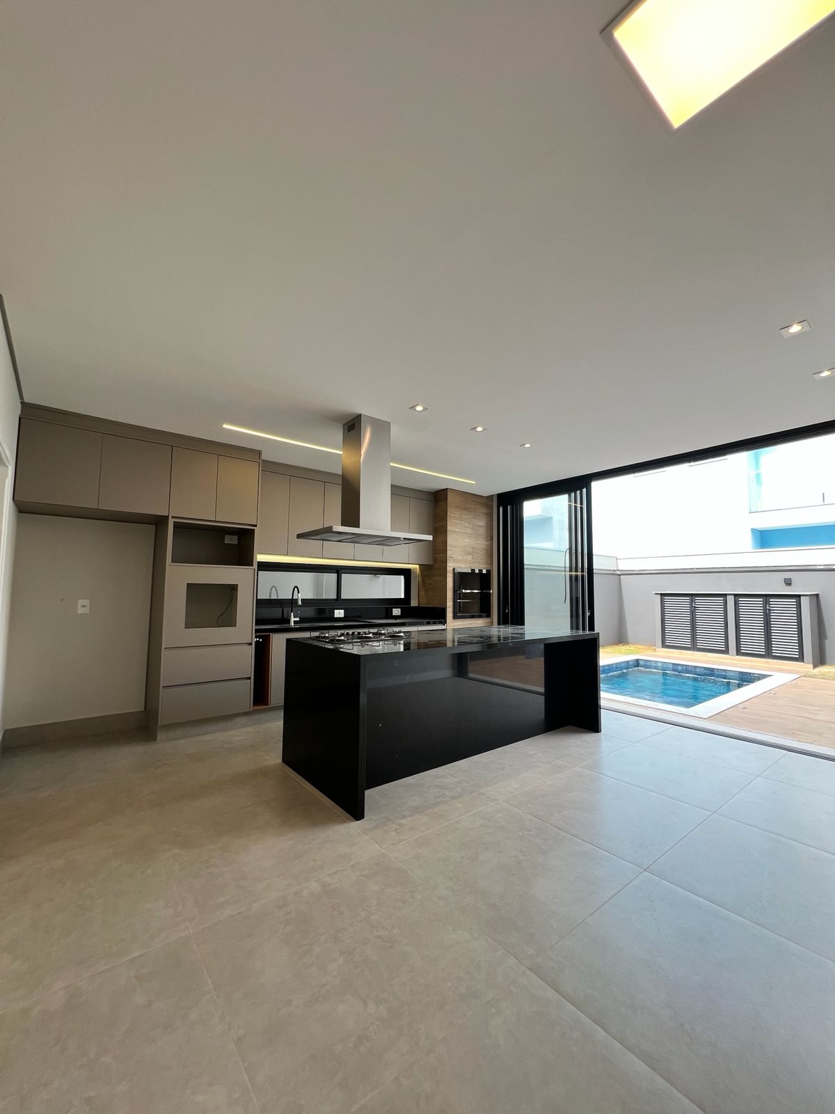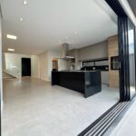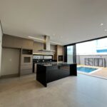No piso inferior, a cozinha integrada se conecta aos espaços sociais, criando um ambiente moderno e acolhedor. As persianas automatizadas trazem tecnologia e conforto ao dia a dia.