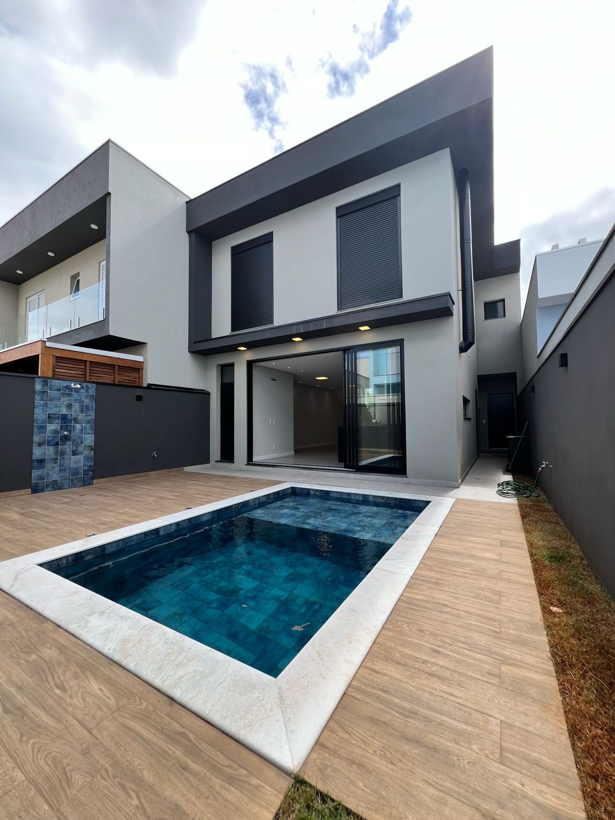 Na área externa, a piscina com hidromassagem proporciona um espaço de lazer privativo, complementando o projeto com elegância.