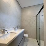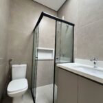 No pavimento superior, o imóvel conta com três suítes, sendo a suíte master com closet. Ao todo, são cinco banheiros, oferecendo praticidade tanto para a rotina da família quanto para receber convidados.